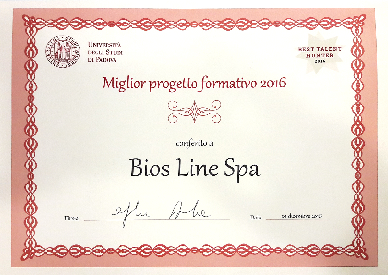 Bios Line è stata premiata ieri dall’Università degli Studi di Padova come azienda con il miglior progetto formativo, all’interno di “Best Talent Hunter 2016”, il premio che valorizza le aziende che si sono distinte nelle attività di stage con gli studenti universitari nell’anno accademico 2015/16.